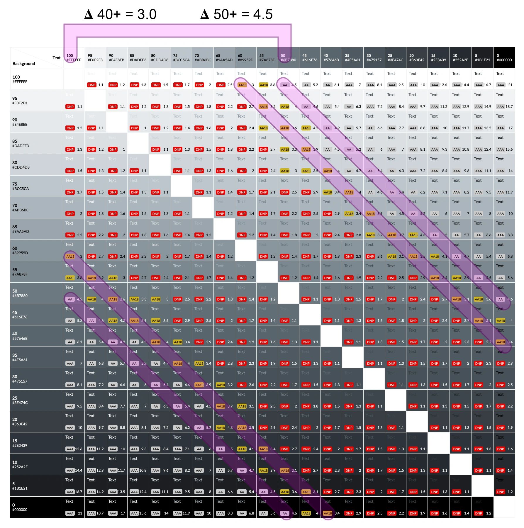 The beauty of this system is that each identically numbered color has the identical contrast ratio, regardless of hue or saturation. Additionally, the contrast ratios were carefully chosen so that any 2 colors with a difference of |40|+ will yield a contrast ratio of 3.0+, while a difference of |50|+ will always yield a ratio of 4.5+
