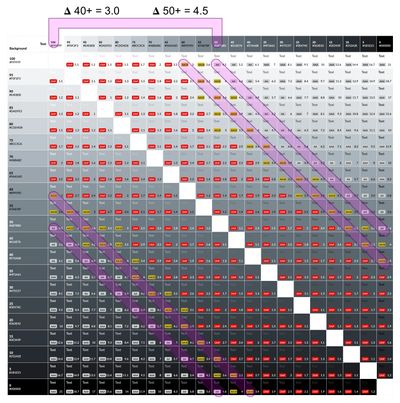 Any 2 colors with a difference of |40|+ will yield a contrast ratio of 3.0+, while a difference of |50|+ will always yield a ratio of 4.5+